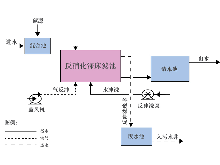 反硝化深床濾池上實質是一種填充式的固定膜反應器。它是與給水過濾相結合的一種生物膜法廢水處理工藝,屬于生物過濾技術。細菌和其它微生物以一層薄膜生長在固體介質上,當流體在固體濾料上流過時,利用濾料的攔截和濾料上生物膜的生物降解雙重作用來將污染物加以去除。