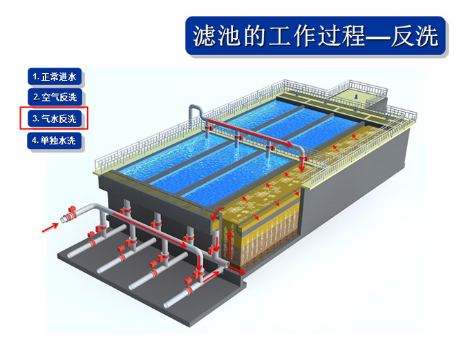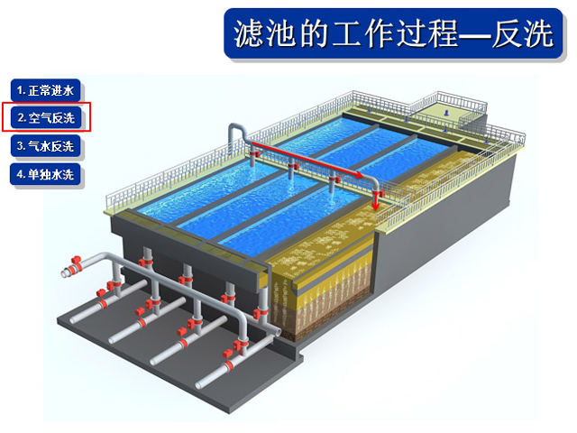 反洗風機:由羅茨鼓風機按設定的風量,通過整個濾池底盤輸入反沖洗空氣。