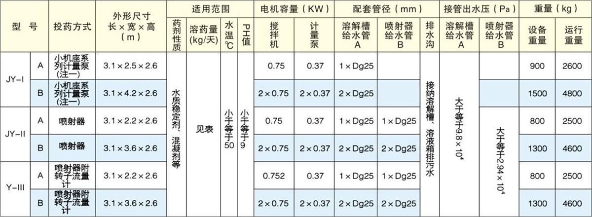JY型加藥裝置配有一個玻璃鋼材質的藥劑溶解槽,并配有一套電動攪拌機,兩個藥劑溶液箱,一套投藥裝置及配管、鋼制平臺梯子等原件組成一個整體。