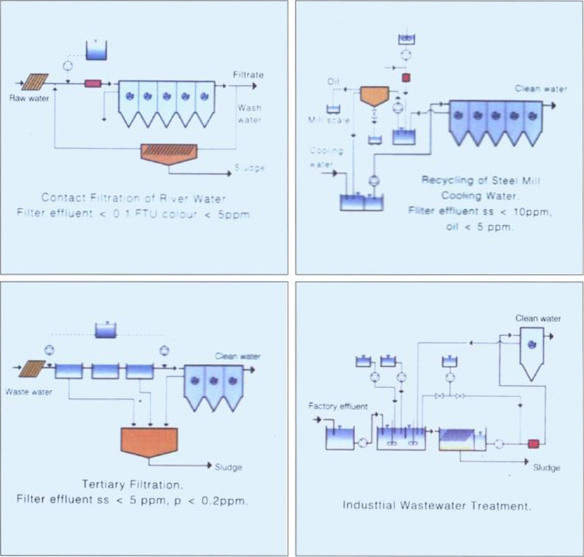 連續(xù)接觸式過濾用于將河和湖水生產(chǎn)成工業(yè)用水或飲用水,也用于廢水處理:絮凝化學(xué)藥品被添加到連續(xù)流砂過濾器進(jìn)水,濾床前部作為反應(yīng)介質(zhì)為絮凝物快速形成提供了好的條件,無需絮凝池。而且因?yàn)檫B續(xù)流砂過濾器具備處理高濃度懸浮固體的能力,所以污水不需要預(yù)沉降。