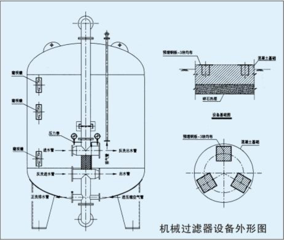機械過濾器是利用一種或幾種過濾介質,在一定的壓力下, 使原液通過該介質,去除雜質,從而達到過濾的目的。其內裝的填料一般為:石英砂、無煙煤、顆粒多孔陶瓷、錳砂等,用戶可根據實際情況選擇使用。