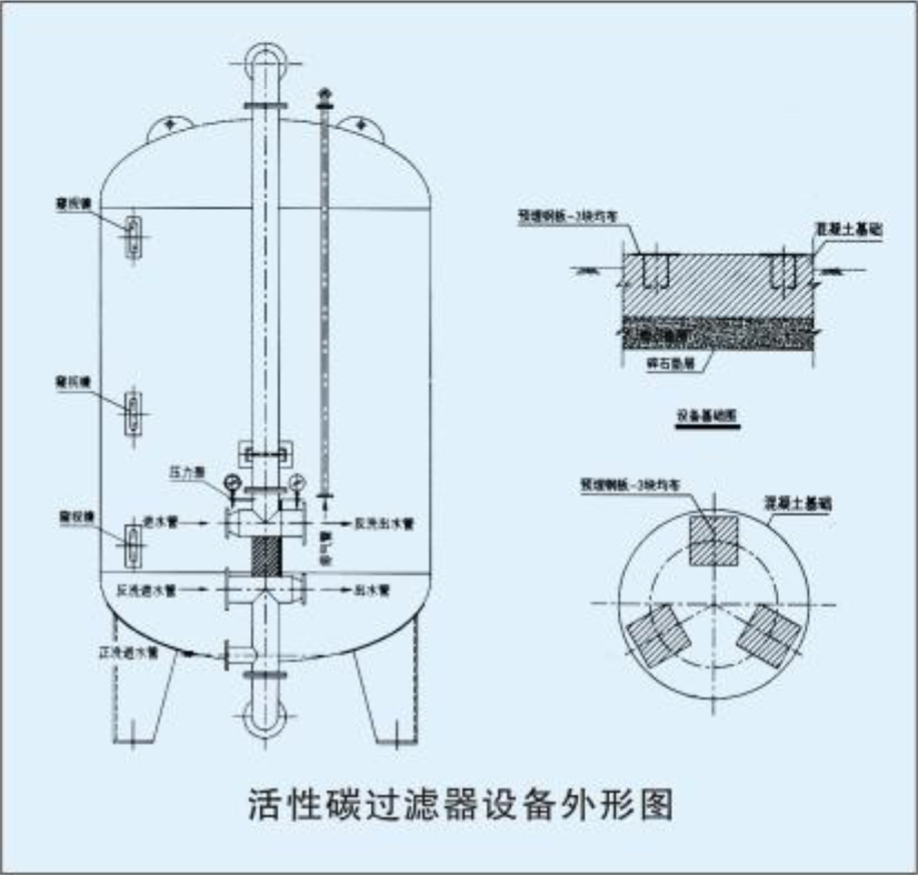 該活性炭過(guò)濾器主要由活性炭層和承托層組成?;钚蕴烤哂邪l(fā)達(dá)的孔隙,比表面積大,具有很高的吸附能力。正是由于活性炭的這種特性,它在水的深度處理中被廣泛使用,如生活給水,污水后段的(凈水)深度處理等。