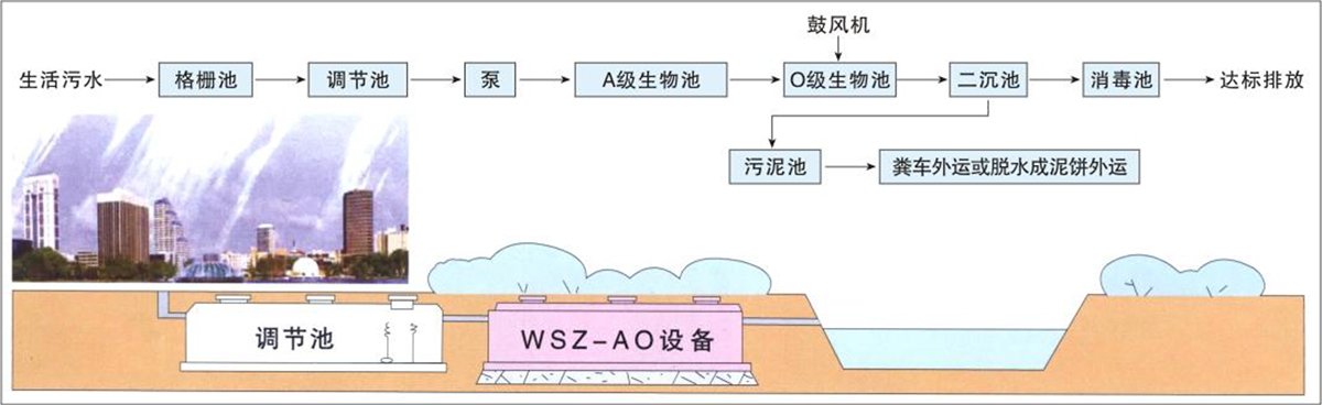 1、WSZ-AO系列污水處理設(shè)備可埋入地表以下,地表可作為綠化或廣場用地,因此該設(shè)備不占地表面積,不需蓋房,不需采暖保溫。