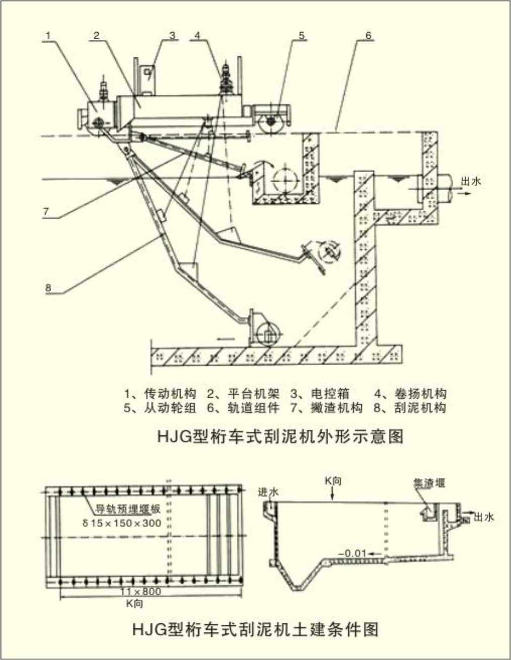 本機由行車桁架、驅動裝置、撇渣機構、刮板升降機構、程序控制及限位裝置等組成。動力線及信號線的收放裝置可按用戶的要求提供電纜卷簡、滑觸線及滑線裝置。刮泥機構在不刮泥回程時刮泥耙全部抬起。當回到刮泥的起始位置時,刮泥耙落下。